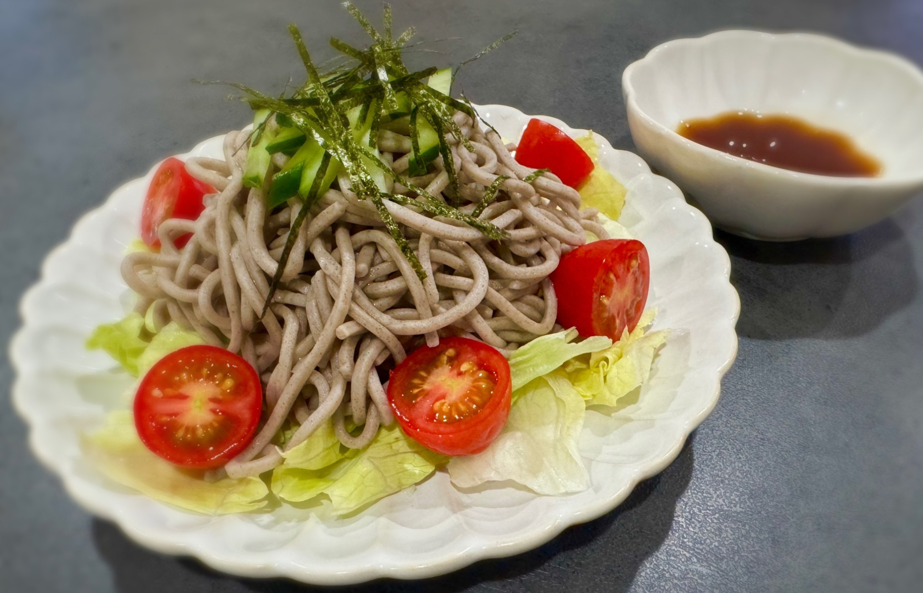 茹でたおそばをしっかり水でしめて、レタスやトマト、きゅうり