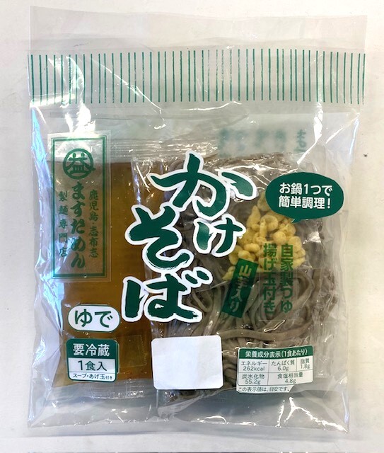 | 原材料 | 【麺】小麦粉(国内製造)、そば粉(志布志産)、還元水飴/酒精 【つゆ】醤油(小麦・大豆を含む)(国内製造)、果糖ぶどう糖液糖、発酵調味料、かつおエキス、こんぶエキス、食塩/調味料(アミノ酸等)、甘味料(ステビア、カンゾウ)、カラメル色素、ビタミンB1 |
